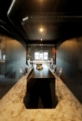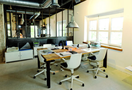 Au milieu, trône un container rouillé, issu du Port autonome de Strasbourg, où est installée une salle de réunion. Autour de celui-ci, sont disposés les vingt-huit postes de travail du personnel d’Advisa s’affairant sur de solides tables en chêne. Olivier a parcouru les puces et antiquaires afin de meubler l’agence, flambant neuve et pourtant déjà patinée : vestiaires métalliques vintage, lampes suspensions venant d’anciennes usines et achetées « sur un parking, à un particulier » ou encore tabourets un peu amochés, dégottés dans des brocantes ou sur Le Bon Coin. Même les couverts en argent, façon ménagère de mémé, ont été chinés. Selon Olivier Kubler, qui a le sens du détail, l’idée était de créer « un décor inspirant, ayant du caractère. C’est important, surtout si on évolue dans les métiers de l’image. »