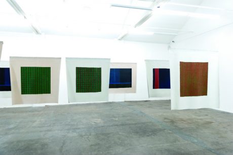 Alicia Knock a conçu l’exposition comme un « lieu déterritorialisé », un projet qui « interroge les frontières intimes et collectives », convoquant beaucoup de Valérie (Belin, Favre3 et Jouve), mais aussi Farah Atassi, Carole Benzaken, Anne-Marie Schneider ou Ulla von Brandenburg. Cette dernière présente Blue Curtain, Yellow Curtain, Pink Curtain, installation jouant sur l’espace en le découpant grâce à du textile (bleu, jaunes et rose) suspendu et tombant avec grâce. L’œuvre de la plasticienne allemande évoque le théâtre et ses lourds rideaux s’ouvrant sur une scène, la peinture maniériste et ses drapés sensuels ou une architecture avec ses couloirs de circulation. Le visiteur “s’introduit” dans l’installation par une fente entre deux plis de tissu, comme un clin d’œil à Hon de Niki de Saint Phalle, conviant le public, en 1966, à pénétrer dans une sculpture monumentale anthropomorphique par son sexe. « Les gens semblent passer sous des jupes », s’amuse Pierre-Jean Sugier. Durant l’exposition, nous errons de l’intime à l’universel, comme c’est le cas avec le travail politique de Maja Bajevic qui utilise le même médium qu’Ulla von Brandenburg pour interroger l’industrie de la filature (nous sommes dans la région mulhousienne). Le directeur de Fernet-Branca : « Au XIXe siècle, les entreprises européennes imprimaient des motifs traditionnels venus d’Indonésie ou d’Afrique et vendaient leurs étoffes à l’autre bout du monde afin de concurrencer la production locale. Il s’agissait d’une pratique économique très en vogue alors qu’aujourd’hui, c’est l’inverse », avec le made in China excessif et les contrefaçons de sacs aux monogrammes Vuitton bâclés ou autres imitations cheap de grandes griffes françaises. Pour l’installation Import / Export, Maja Bajevic interroge ce process en “mettant en concurrence” deux sociétés chinoises, leur soumettant des motifs géométriques qu’elles ont reproduit sur des toiles. Exposées, ces deux séries abstraites questionnent autant la mondialisation que la notion de reproduction.
