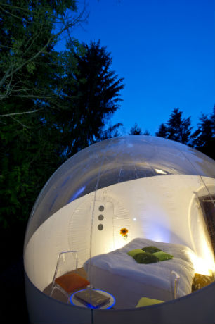 En Alsace, les chambres de Bulles et une nuit, propriété de Marion Bouwy, sont plus classiques. Toutes dans le même esprit, les maisons évoquent aussi bien un cocon qu’un vaisseau spatial et se composent de trois alvéoles accolées. La première, sorte de sas, sert de dressing alors que c’est dans la grande transparente du milieu qu’on s’endort sous les étoiles. La troisième, plus intime, fait office de salle de bains. Alliant design, confort et écologie, les bulles garantissent une nuit à la belle étoile sans subir les caprices de la météo.