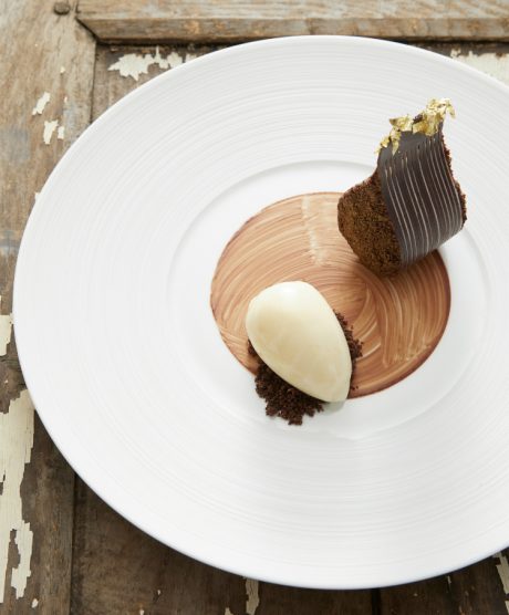 « Un endroit où chacun puisse se sentir bien » : voilà la définition du “grand restaurant“ des années 2020 donnée par Serge Schaal. Le directeur de salle1 revendique « un service qui ne se voit pas, une envie de faire plaisir. En un mot, il s’agit d’aimer les gens. » Mission accomplie dans une Fourchette des Ducs récompensée par deux Étoiles au Guide Michelin depuis 2005. Installé dans une maison centenaire voulue par Ettore Bugatti, l’établissement offre un décor gracieux où se mêlent cristaux précieux – Baccarat pour le Salon d’été et Lalique pour le Salon d’hiver –, mobilier moderne chic et œuvres de Charles Spindler, comme un portrait de Sainte-Odile entourée de grappes de raisin peint sur le trumeau d’une cheminée, où éclate une douceur et un hiératisme hérités de l’Art nouveau rhénan. Une image qui va comme un gant aux assiettes de Nicolas Stamm : « Ma cuisine n’est pas une “cuisine Instagram”. Elle ne fume pas, ne fait pas de bruit. Dans mes plats, il y a de la mâche, de la matière », résume-t-il. Sensibilité, bienveillance, classicisme : voilà quelques mots qui pourraient décrire le travail d’une toque (trop) discrète qui semble mettre ses pas dans ceux du délicat Alain Chapel2.
