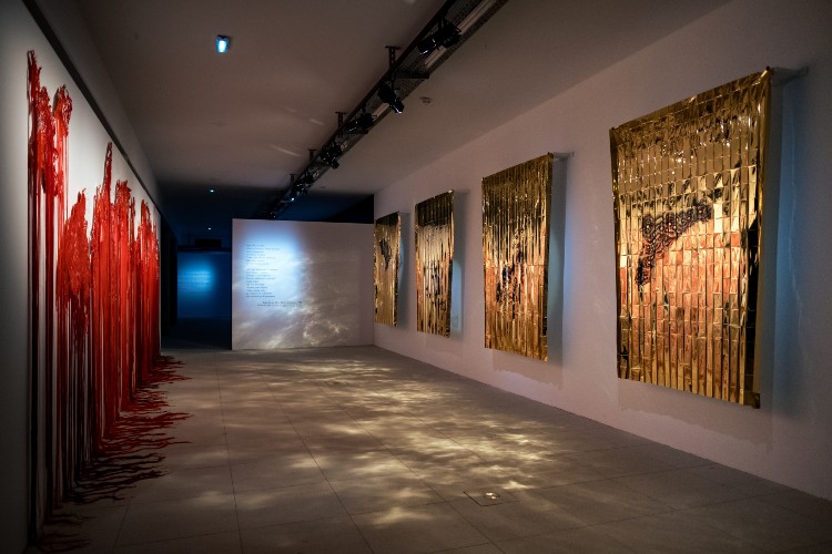 Île… était une fois la cale obscure d’un bateau, le bruit assourdissant des vagues et du vent, le roulis qui rend fou, avec pour seul espoir la lueur fragile d’une ampoule grésillant au plafond. Ainsi débute la traversée de Nos îles, exposition en forme d’exploration de l’insularité dans toutes ses métaphores variées. D’entrée de jeu, l’immersive installation sonore de Philippe Lepeut (C’est du vent, 2015) arrache le visiteur à la terre ferme de la réalité pour le transporter vers les rives d’un ailleurs… Paradis ou enfer ? Sans doute les deux, mon capitaine ! À l’instar de cette cabane de bois à taille réelle, entièrement meublée, que l’on découvre en s’enfonçant dans la jungle après avoir accosté. Refuge (2007) atypique vers lequel on se sent irrésistiblement attiré, mais dont le plasticien Stéphane Thidet a fait un lieu diablement hostile, à l’intérieur duquel une pluie tropicale se déverse avec fracas, sans discontinuer. Hypnotique… et glaçant ! Dedans / dehors : tout est inversé. Quant aux trois autochtones du Mulhousien Pierre Fraenkel (Monstrum, 2020), qui se tiennent à quelques mètres de là, avec leurs coiffes chamaniques tressées de fils DMC rouge sang et leurs cornes acérées, c’est à se demander s’ils ne s’apprêtent pas à célébrer une quelconque cérémonie rituelle, dont le naufragé serait – au choix, selon le rapport qu’on a à l’étrangeté – l’invité de marque ou la victime à sacrifier.
