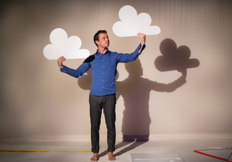 Un enjeu dont il a pris la mesure en restituant un environnement rassurant, propice à l’évasion : c’est presque à pas de loup que l’assistance place face au comédien qui l’attend déjà dans un décor minimaliste et bigarré. La compagnie en a fait sa marque de fabrique « afin de donner au spectateur l’espace nécessaire pour laisser libre cours à son imagination, ce qui implique de se débarrasser de toute distraction superficielle. » À la clé, un objectif ambitieux : celui d’initier les plus jeunes aux multiples plaisirs de la lecture. Car à mesure que les yeux se promènent sur les mots et s’attardent sur les images, un nouveau monde s’éveille, celui de l’imaginaire. Et si, le temps d’un spectacle, celui-ci prenait vie ? Tout commence par l’ouverture d’un simple livre : une page se tourne, un personnage singulier en jaillit aussitôt. Dans ses mains, un livre dont s’échappent à leur tour des nuages qui cherchent à prendre leur envol. Le narrateur- personnage fait dé ler les tableaux en jouant avec les ombres et la scénographie : comme dans un pop-up, les différents éléments de l’histoire arrivent par surprise. Jongleur, pantin ou magicien, il invite à la découverte d’un paysage irréel, à une balade surprenante au fil des saisons où montagnes et ruisseaux se déploient sous nos yeux. Enfants et parents embarquent ainsi pour un voyage immobile tout en sensibilité.