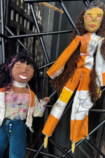 Parmi ces dignes héritiers de Pinocchio, remarquons un charmant dragon rouge et jaune, avatar plutôt sympathique de Godzilla à l’air un brin mélancolique, ou une fée toute rose faite de bric et de broc. Plus loin, une joueuse de tennis fait un grand écart à la Suzanne Lenglen, tandis que deux copines au look seventies se préparent visiblement pour aller au concert ! Dans ces univers de tissu et de papier mâché, se déploient parfois des mains jaunes jouant avec des fils, sans doute histoire de rappeler que le grand marionnettiste demeure humain.