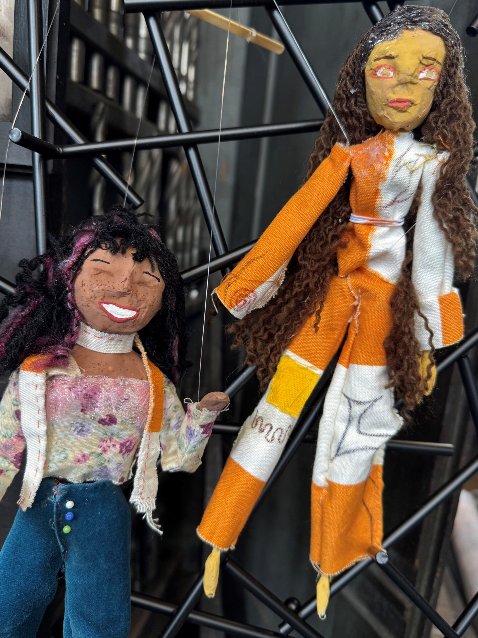 Parmi ces dignes héritiers de Pinocchio, remarquons un charmant dragon rouge et jaune, avatar plutôt sympathique de Godzilla à l’air un brin mélancolique, ou une fée toute rose faite de bric et de broc. Plus loin, une joueuse de tennis fait un grand écart à la Suzanne Lenglen, tandis que deux copines au look seventies se préparent visiblement pour aller au concert ! Dans ces univers de tissu et de papier mâché, se déploient parfois des mains jaunes jouant avec des fils, sans doute histoire de rappeler que le grand marionnettiste demeure humain.