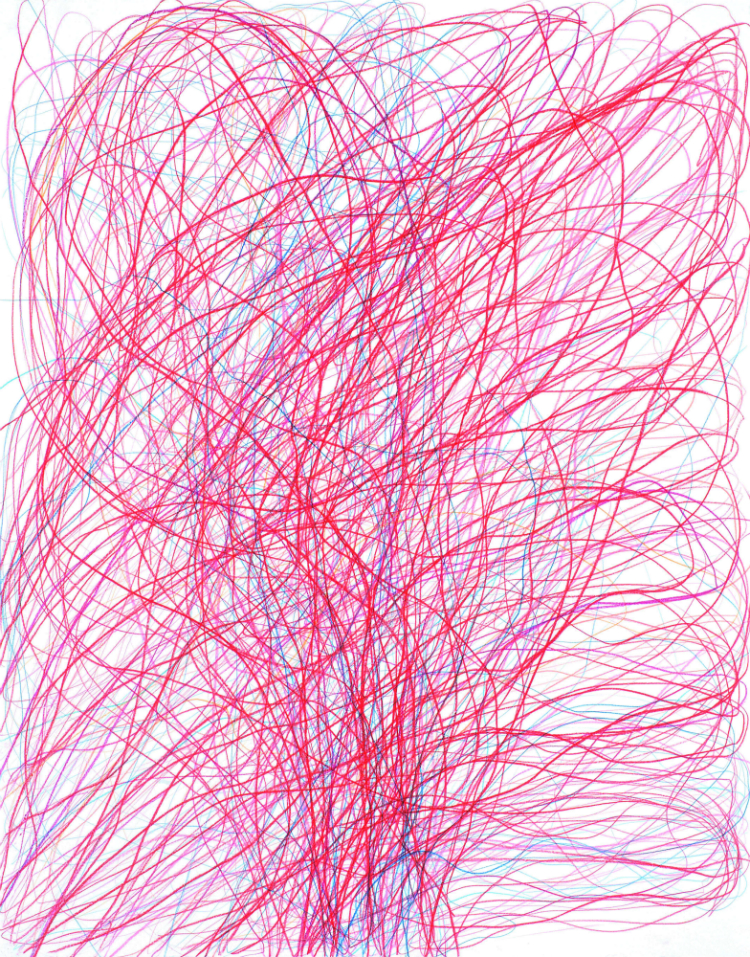 Les plasticiens suisse et franco-vénézuélien travaillent de manière très différentes, mais s’intéressent à la ligne. Gelzer réalise des travaux sur papier obsessionnels : des lignes, dessinées au crayon de couleur ou à la mine de plomb, s’entremêlent, tournoient et se densifient, créant des flux et réseaux. Il construit des arabesques de grand format, fait de petites peintures où les formes s’interpénètrent et prend des photos dans lesquelles il est également question de lignes. Raúl Illarramendi est quant à lui a l’affut des traces laissées dans l’espace public : dessins d’enfants sur le pare-brise sale d’une voiture ou marques faites sur les murs de nos cités. Il les photographie avant de s’en servir de point de départ pour des toiles abstraites. Il refuse « de concevoir la ligne comme un moyen pour construire l’espace dans la page, au privilège d’un remplissage perpétuel de la surface, comme le ferait la peinture. »