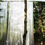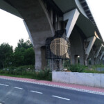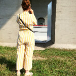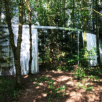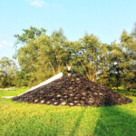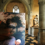 La chasse aux trésors artistiques, architecturaux et paysagistes nous mène notamment dans un sous-bois où une structure circulaire délimite un espace théâtralisé grâce à des rideaux étincelants. Sur les voilages tombant entre les arbres élancés sont imprimés des détails ultra-zoomés de “La Tour de Babel” (1553) qui se fondent dans le décor : “Model for a Tower”, œuvre du bureau d’architecture OFFICE KGDVS & Bas Princen place le visiteur au cœur de la toile du maître où les éléments, les époques et les territoires s’entremêlent. Ce “pavillon”, intervention scénographique et photographique, répond à l’œuvre Sint-Anna-Pede, située plus loin, dans un tout autre cadre, sous un viaduc ferroviaire : une maisonnette inachevée réduite à ses échafaudages qui renvoie à la fois aux habitations périphériques et à la tour babylonienne utopiste de Bruegel. En son centre, un cercle peint sur la structure en bois figure, par anamorphose, un soleil couchant (selon l’emplacement du regardeur), concluant un trajet en un trompe-l’œil éphémère.