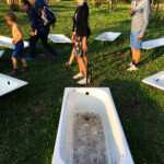 Nous ouvrons grand les yeux, chaussés de bonnes baskets, tout au long des sept kilomètres du sinueux parcours à travers lotissements et champs. Un chemin artistique traversant des étendues de blés ou maïs, madeleines proustiennes de l’immense comédien Josse de Pauw qui évoque oralement, via un poétique audio-guide, le « cher paysage ondoyant » de sa jeunesse. Le monde rural contemporain et l’univers pastoral des gamins ont inspiré le bureau d’architectes-paysagistes de Landinzicht, pour un vaste terrain de « Jeux d’enfants” fait d’objets cheap caractéristiques du domaine agricole : silos en polyester transformés en instruments de musique de fortune ou baignoires / abreuvoirs customisés devenant amusants jets d’eau. Ludique, humoristique et artistique, cette installation interactive, hommage aux “Jeux d’enfants” (1560) de Bruegel, questionne avec malice la disparition des paysages ruraux au détriment d’une périurbanisation plus sauvage que les inhospitaliers marais du Pajottenland.