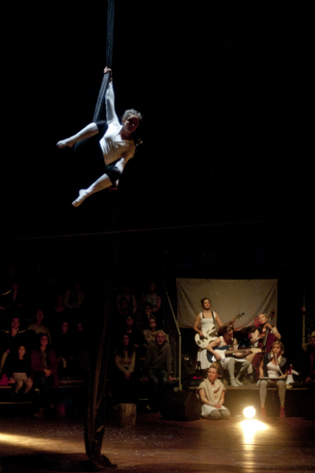 Entre la franche camaraderie de copines en week-end dans un camp de base hivernal où l’on se chamaille pour le plaisir et des numéros de cirque relevés, ces nanas qui n’ont peur de rien passent à la moulinette de leur folie auto-proclamée un des grands romans du père de la littérature finnoise : Les Sept frères d’Alesksis Kivi. Ici, on tchatche autour d’un réchaud pour la soupe pendant que d’autres jouent une tempête de neige bricolée pour montagnardes en ski, à califourchon l’une sur l’autre. Les clichés sur les pays nordiques sont battus en brèche : la vodka se boit d’un trait pour se donner du courage dans le froid, les acrobaties naissent dans une intime obscurité et les instruments se saisissent à la volée pour une mélopée traditionnelle comme un rugueux morceau punk façon Pussy Riot ! Derrière cette désarmante facilité, les interprètes cachent un solide bagage technique dont les passages au tissu comme au trapèze suffiront à ravir les plus exigeants. Le tout, sans une once de prétention, comme s’il convenait plus que tout de prendre un malin plaisir à surprendre avec une aisance déconcertante, à l’image d’un duo sur rola-bola – plateau placé en équilibre sur un cylindre – où l’on se déshabille la tête en bas dans des positions incroyables et un fou rire de petites malignes croquant la vie tout en balayant les conventions.