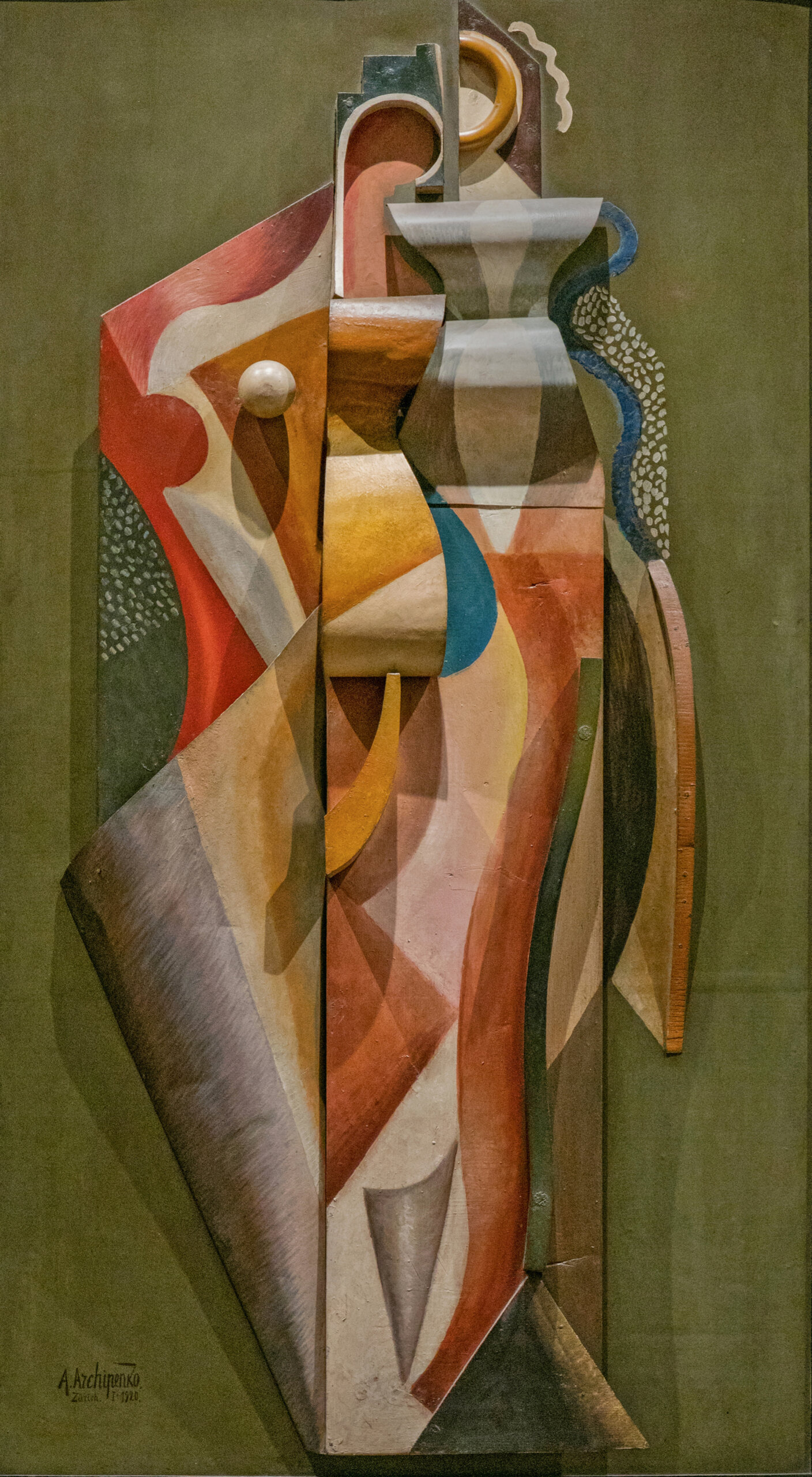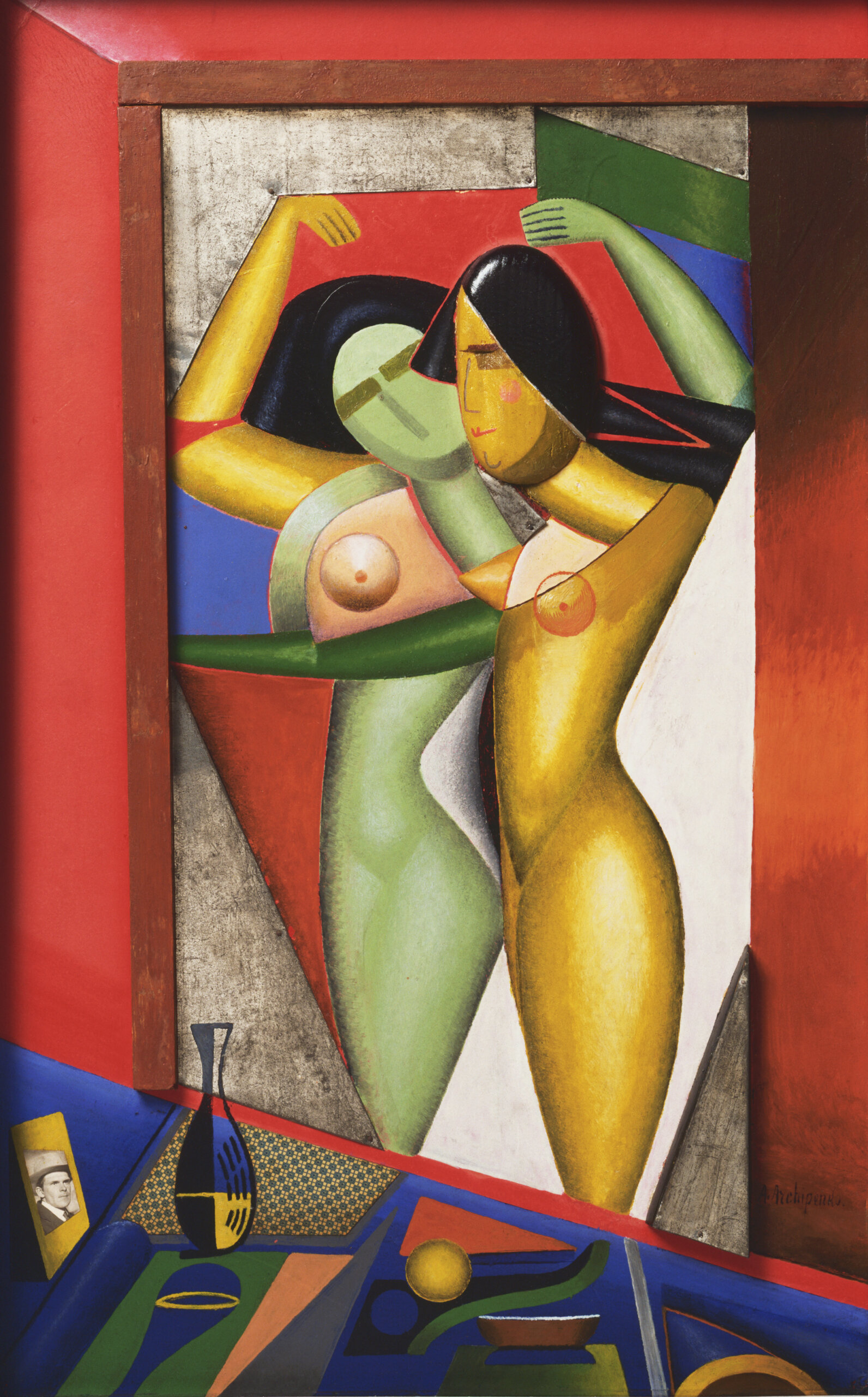 Les formes éclatent de vie. Sont mouvantes. Comme celles de son complice dont les sculpto-peintures – « reliefs généralement faits de plâtre sculptés et peints », résume Marcel Duchamp – fascinent, à l’image de Deux Femmes (1920). Cubiste dans l’âme, Alexander Archipenko fait des échappées belles vers le futurisme (Danse, 1912-17), jouant sans cesse entre convexe et concave dans des compositions tutoyant parfois Dada. On voit les imprégnations multiples à l’œuvre entre deux artistes qui revivifient les avant-gardes, donnant un nouvel essor, après la Guerre, à La Section d’Or, groupe né en 1911. Si leur relation s’étiole très rapidement autour de 1920, cette exposition retrace un intense itinéraire commun, permettant surtout de mettre en exergue la trajectoire de Marthe Donas à qui justice est rendue. Son évolution est perceptible dans un fascinant ensemble de trois dessins intitulés Nu couché (1915, 1917 et 1920), passant de l’académisme bon teint à un cubisme ondoyant, puis à une abstraction radicale évoquant De Stijl. On se souvient alors qu’elle affirmait : « Mon désir de trouver n’est jamais satisfait. Cependant, j’ai toujours poursuivi la synthétisation, une grande simplification et la réalisation de l’infini dans le fini. »