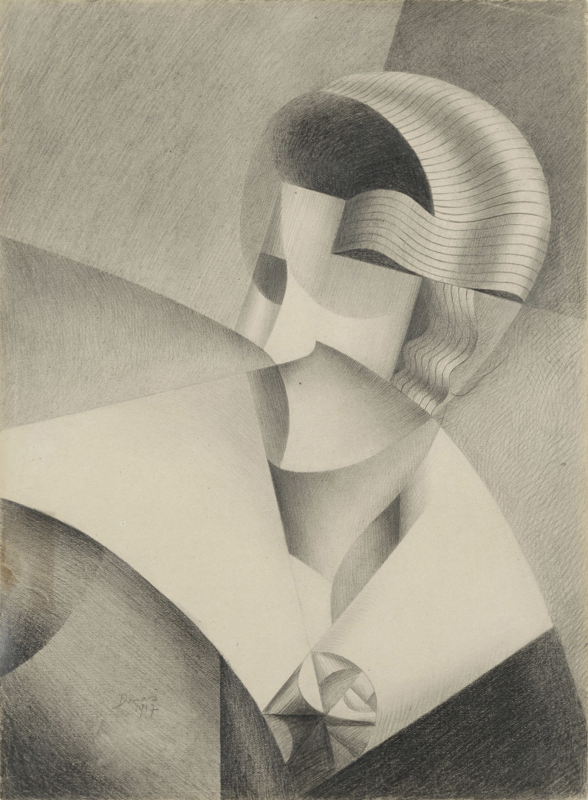 Le seul horizon de Marthe Donas (1885-1967) ? Peindre. Pour une femme, née dans une famille bourgeoise d’Anvers, c’est alors une gageure. En 1916, elle s’installe à Montparnasse, travaillant dans l’atelier d’André Lhote : le cubisme est une révélation. Partie à Nice, la rencontre avec Alexander Archipenko (1887-1964) fera des étincelles. Le sculpteur ukrainien avait créé une petite révolution en postulant que le vide était un volume en soi, imaginant des ouvertures au sein même des éléments structurants – torse et tête, principalement – pour des œuvres marquées du sceau du mouvement. Pendant quelques années, le duo va expérimenter les relations possibles entre forme, volume et couleur. Sous le pseudonyme Tour d’Onasky – rapidement abrégé en Tour Donas –, elle se fait un nom grâce à des dessins à la puissante élégance moderne, comme Tête cubiste (1917) ou des « shaped canvas » (où le châssis est découpé suivant le motif de la peinture, un genre popularisé par Frank Stella dans les sixties), dont elle est une pionnière. Pensons à Poupée cubiste (1917-18) avec ses textures variées où alternent surfaces lisses, griffées et rugueuses (obtenues grâce à une émulsion travaillée avec du sable) dans une grande délicatesse. La marque de fabrique d’une plasticienne à la palette sensuelle, où verts, roses pâles et teintes nacrées se répondent avec grâce.