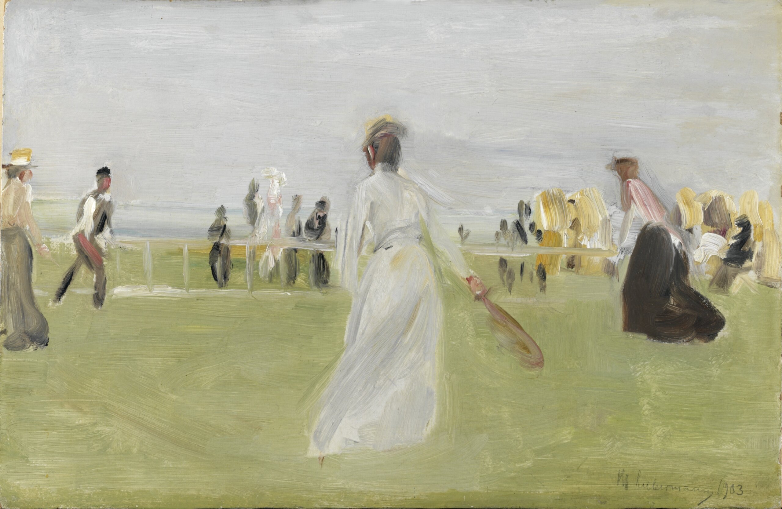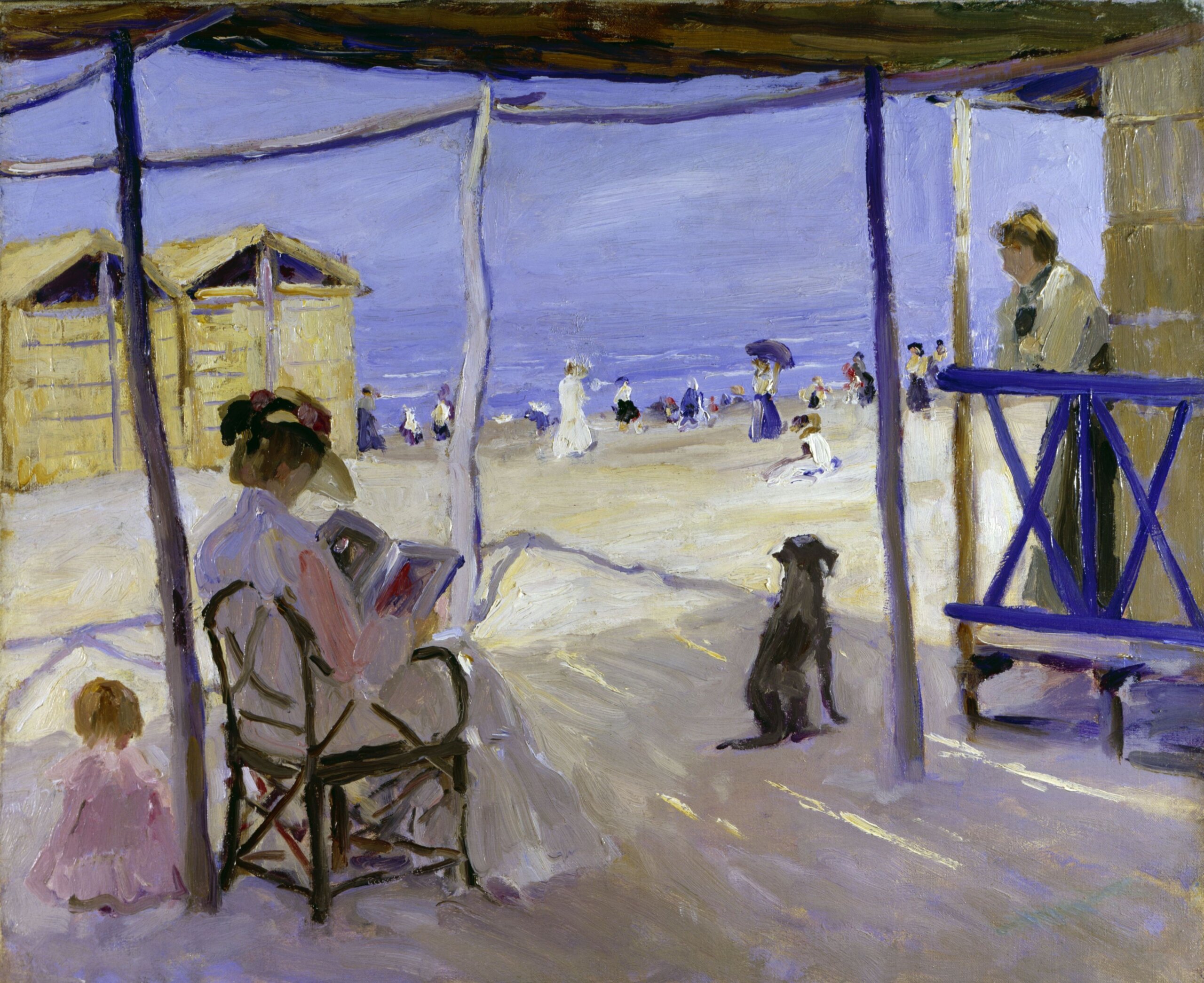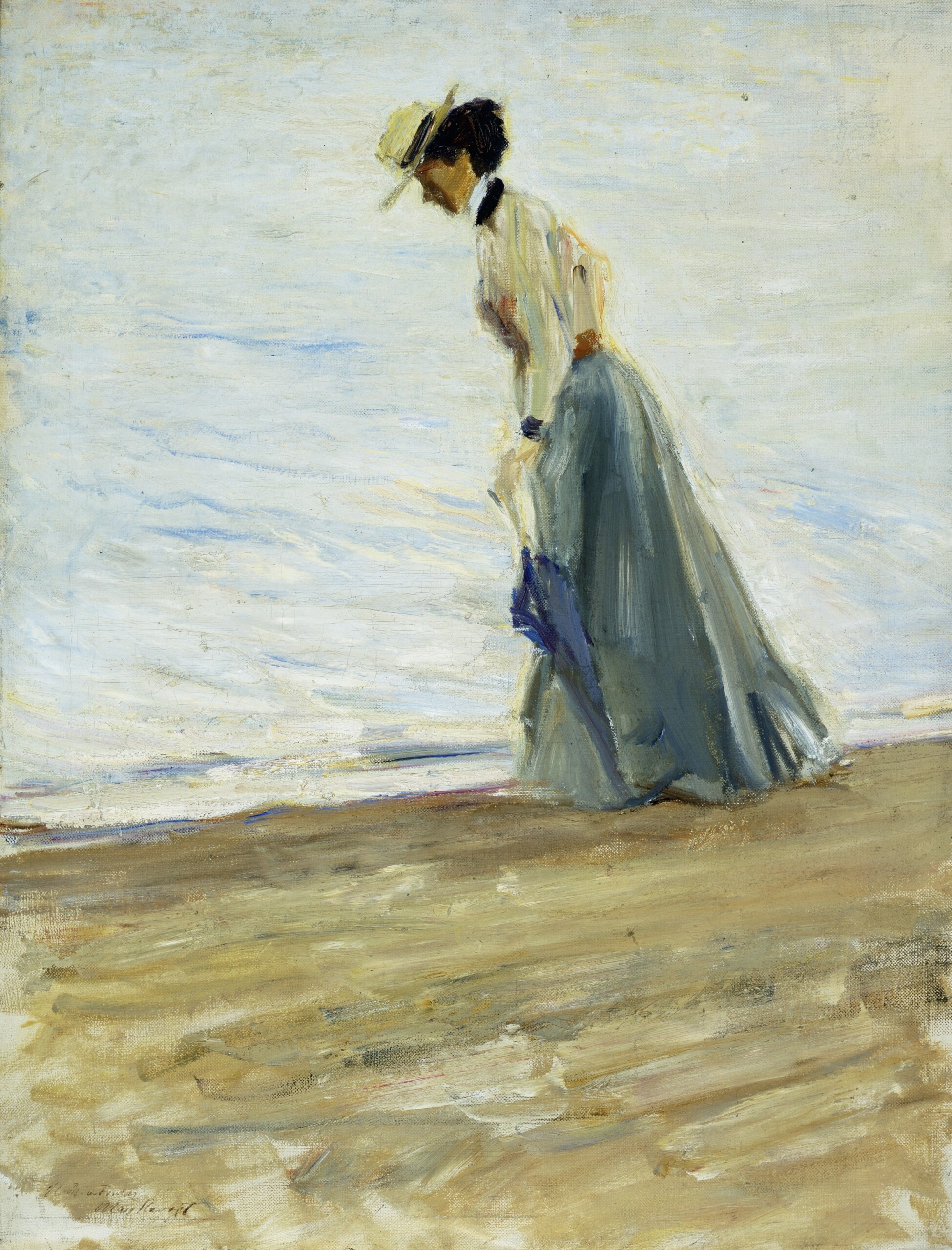 Dès le début de sa carrière, Philipp Klein se montre un maître des lumières et des couleurs : en témoigne, par exemple, Lever de soleil sur le Chiemsee (1893), subtil jeu chromatique évoquant la rencontre, sur les rives d’un lac de Bavière, entre l’icône de Monet Impression. Soleil levant (1872) et les huiles flottantes de Turner. Si on aime ses paysages – plusieurs vues des plages de Viareggio peintes en 1906 sont d’une grande noblesse –, les portraits séduisent plus encore. Pensons à Homme au bain (1899) où il montre (sans doute) Lovis Corinth émergeant de l’onde, les yeux fermés et la bouche ouverte dans une étrange grimace : voilà vision singulière en avance sur son époque, puisqu’il saisit l’instant avec finesse, comme si un « arrêt sur image » était opéré. Qu’il représente la danseuse Jane Avril (1898), la chanteuse Yvette Guilbert (1898) – reprenant les codes des affiches de cabaret de manière ultra glamour – ou une anonyme Dame au chien (1901), dans une robe blanche très chic, il met en scène des femmes puissantes à la personnalité affirmée dont la place va croissante dans le milieu de l’art. S’il peint ainsi son amie Lotte von Marcard en majesté – Dame avec roses (1904) –, l’exposition souligne également qu’elle fut une créatrice majeure (somptueuse Nature morte aux fleurs, vers 1920), tout comme Paula Modersohn-Becker, dont Paysage de Worpswede avec maison rouge (1899) est d’une stupéfiante modernité dans sa construction.