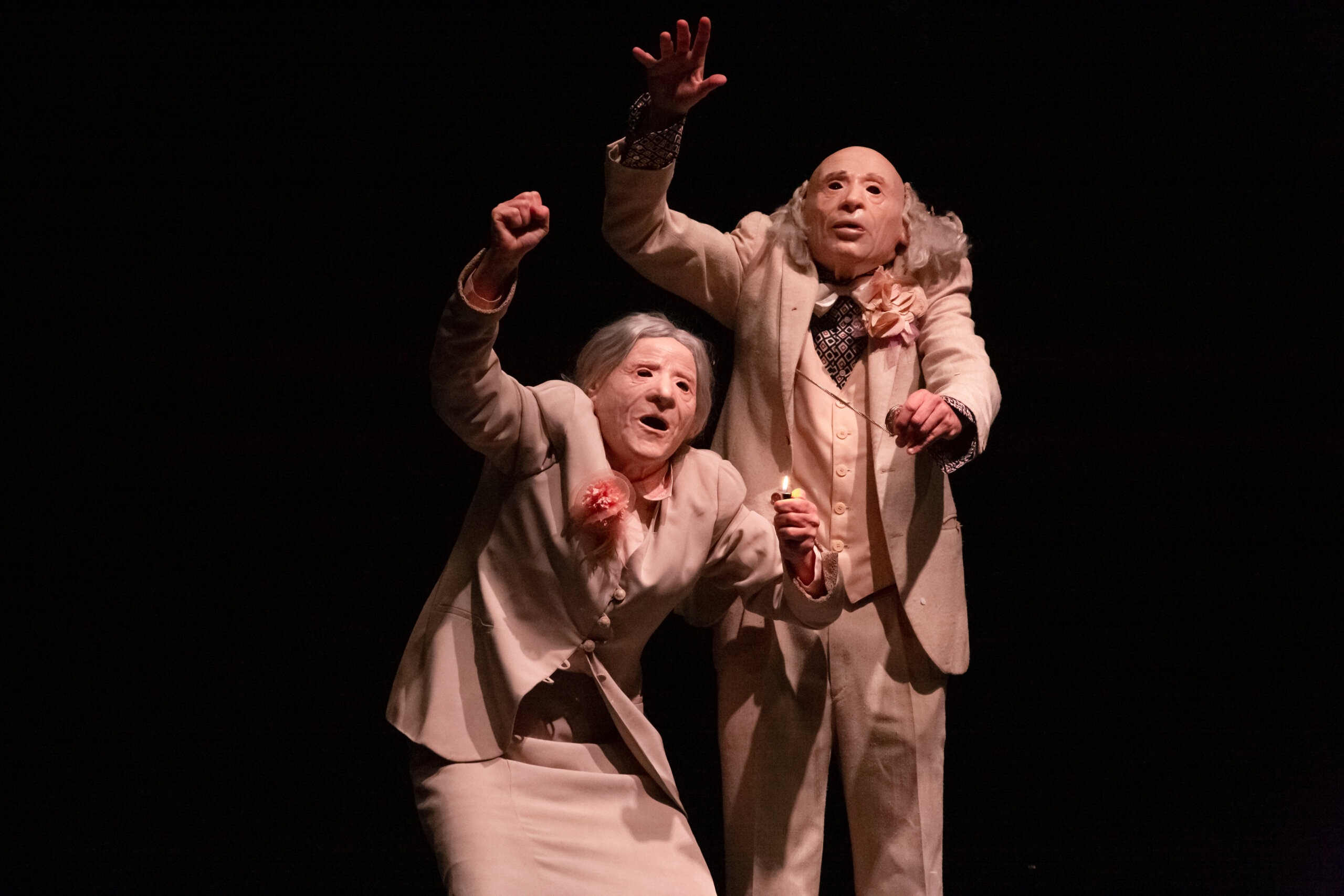Si le titre du spectacle renvoie au morceau éponyme du chanteur – et acteur – italien Claudio Villa, le propos d’Il Tango delle capinere a une longue histoire. Réactivé en 2023 par Emma Dante, il est une reprise de Ballarini, épisode final de la Trilogie des Lunettes (2011) s’intéressant à trois histoires intimes. Dans ce volet de clôture, un homme et une femme, tout d’abord grimés en vieilles personnes à l’aide de masques et d’un langage gestuel bien rôdé, retombent peu à peu dans les souvenirs de leur vie à deux. Plus ils remontent le fil de leur histoire, plus ils rajeunissent sous les yeux du public, regagnant en mobilité et alternant quelques scènes parlées avec des moments chorégraphiés, sur de célèbres titres du répertoire italien des années 1960-70. Dans une version repensée pour se différencier du triptyque original, Sabino Civilleri et Manuela Lo Sicco, deux des acteurs iconiques de la compagnie Sud Costa Occidentale, reprennent leur rôle dans un hommage à la génération qui nous a précédés, et plus particulièrement au père de la metteuse en scène.