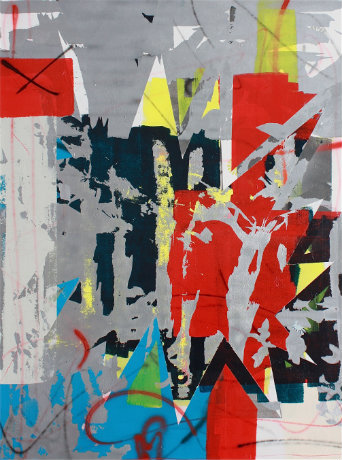 Dans son atelier, Mathieu Wernert peint, colle, décolle, compose, décompose, bombe… histoire de passer derrière le miroir des apparences, d’exploser la frontière du pigment. Au départ, les surfaces « sont “propres”. Ce n’est qu’ensuite que je les reconstruis en les détruisant, en arrachant la peinture avec des morceaux de scotch, la grattant avec une spatule » narre-t-il. Ses toiles composites évoquant, pêle-mêle, les affiches lacérées de Jacques Villéglé et la cool attitude de Christopher Wool, sont le lieu du mariage improbable entre une réflexion post-pop et une esthétique de l’effacement permanent… L’ombre de Clyfford Still plane également sur un travail où l’acte créatif est aussi important que la création elle-même. Au final, l’œuvre semble s’anéantir pour se noyer dans le vide d’une étrange poésie, celle des friches industrielles, des reliques de la société de consommation. « Mes peintures racontent des histoires, mais je ne cherche jamais à rien imposer. L’accident et le hasard sont prépondérants et, parfois, je les provoque en arrosant le tableau avec de l’eau » explique l’artiste. À chacun donc de s’orienter dans ces univers abstraits d’un puissant chromatisme, où fourmillent les motifs répétitifs, de plonger au cœur de mondes à la semblance d’un étrange mélange entre déco cheap, art urbain et badigeonnages calligraphiques qui métamorphosent l’espace de La Boutique en manifeste d’une plastique apaisée.
