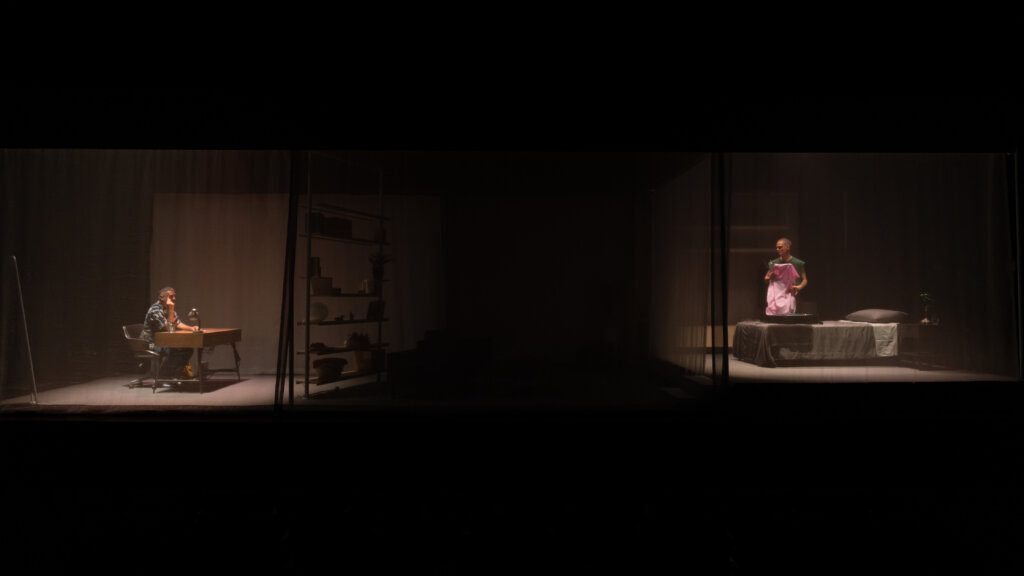 À partir de témoignages récoltés auprès de leurs entourages, amis et connaissances, les deux hommes dressent un portrait explorant les moments marquants – et souvent tragiques – de leur vie : quotidien d’un réfugié iranien en Turquie, enfance d’un petit garçon dans une ferme au bord du lac canadien Saint-Jean, exil en France, condition des populations autochtones innues, violence, discrimination sexuelle, renvoi de chez soi… Honnête, la pièce aborde frontalement des sujets tels que le suicide ou les sévices, se demandant quels facteurs peuvent bien être mis à l’œuvre pour que de jeunes gens choisissent de devenir artistes, alors que rien ne les y prédestinait. Ainsi, Dany Boudreault ouvre sa partition en revenant sur leur rencontre et leurs premières confidences, dans la capitale bosniaque. « Tu m’écoutes sans jugement », dit-il alors. « Je déplie 40 ans en cinq jours », continue-t-il tandis que son complice mène sa performance de son côté, croisant parfois son regard, gesticulant aussi, mais sans émettre le moindre bruit. Gurshad raconte également son arrivée en Bosnie-Herzégovine. « Tu m’attends à l’aéroport, Dany. On prend un taxi. C’est toi qui as géré la réservation. […] L’appel à la prière te fascine. Pour moi, c’est une rengaine trop entendue autrefois qui ne suscite aucune nostalgie. » Avec poésie, le duo nous emmène doucement à la croisée de leurs réflexions, la lumière révélant tout aussi délicatement ce qui les entoure, comme si notre regard s’ouvrait en même temps que les confessions s’égrenaient.