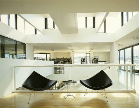 Installée sur le site de Lörch, ancien fabricant d’eau de vie, la Médiathèque de Bühl a été conçue (en 2001) par les architectes du coin, Wurm + Wurm. Il s’agit d’une bâtisse carrée : un plan rigoureux pour un espace intérieur lumineux et ouvert, exempt de parois fixes pour faciliter d’éventuelles modifications d’organisation. L’agence Wurm + Wurm est également responsable de la Carl-Netter-Realschule, à Bühl, qui accueillera l’exposition du concours de construction de maquettes sur le thème Des lumières dans ma bibliothèque, en novembre.