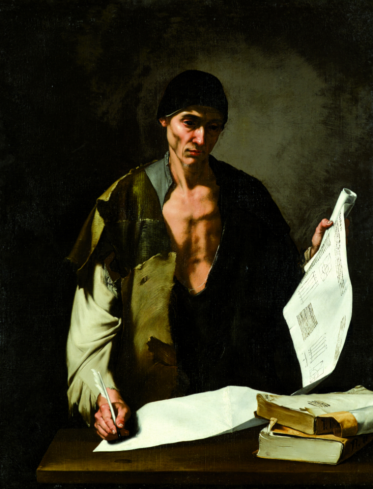 Face à Archimède de José de Ribera, situé entre Thalès et Héraclite, le spectateur est intimidé par tant de prestance. Une lumineuse présence. Se détachant sur un fond sombre, il a le regard satisfait de celui qui semble s’apprêter à s’écrier « Eurêka ! », des papiers griffonnés de formules mathématiques dans une main, une plume posée sur un parchemin vierge de l’autre. Vêtu de haillons qui laissent découvrir sa poitrine blanche, le scientifique grec de l’Antiquité est prêt à écrire LA formule qui révolutionnera la géométrie ou la mécanique statique. Magnifique huile sur toile de la première moitié du XVIIe siècle, cette peinture du plus caravagesque des peintres espagnols est l’un des chefs-d’œuvre exposés au Musée national d’Histoire et d’Art qui rassemble un étourdissant ensemble donnant le vertige aux amateurs d’art baroque.