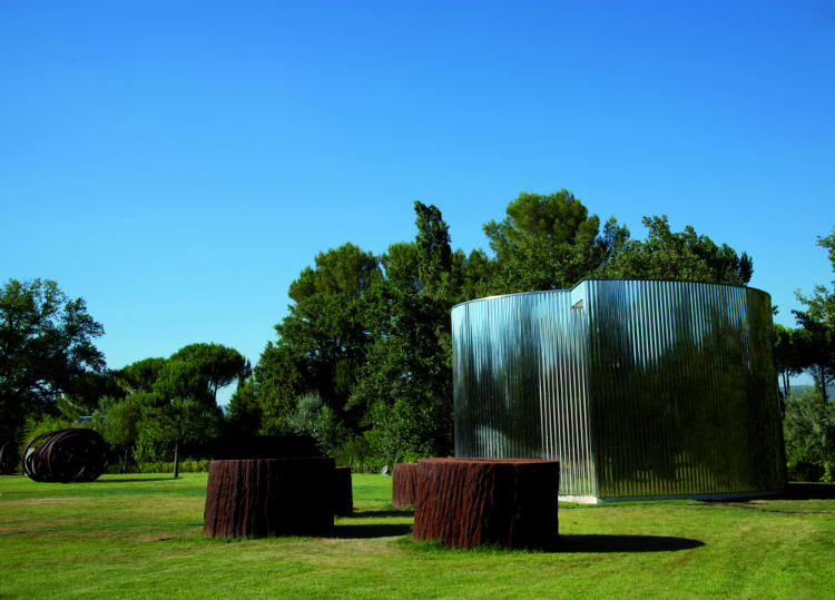 Si nous sommes là, c’est pour découvrir sa collection et son parc de sculptures, ouvert au public depuis peu alors qu’il avait acquis terrain, usine et moulin de 1737, à la fin des années 1980, dans le but de stocker ses pièces XXL. Venet ne souhaitait pas en faire une fondation avant sa mort : « Je voulais avoir la paix », s’exclame-t-il alors que des visiteurs collent leurs nez curieux aux baies vitrées de son salon pour scruter un intérieur peu commun – on les comprend ! « J’ai craqué lorsque nous avons inauguré la Chapelle de Frank Stella dans le parc », faisant référence au kiosque hexagonal installé en 2014 qui abritait six grands panneaux du plasticien américain. « Le public a été très enthousiaste, alors j’ai décidé d’organiser des jours d’ouverture. Je m’y suis fait… » glisse notre hôte, fier d’annoncer l’obtention du Prix Montblanc, récompensant des actions de mécènes dans le domaine des arts et de la culture. « Impossible de se cacher à présent ! » En 2015, il fait construire une galerie d’inox, une architecture contemporaine “miroir” réalisée par le cabinet Berthier + Llamata faisant face à l’usine. L’analogie avec la fondation de son ami Donald Judd, autre artiste collectionneur, est plus qu’évidente. Depuis le début des années 1980, celui-ci développe un temple de l’art minimaliste à ciel ouvert, à Marfa, au beau milieu du désert texan.